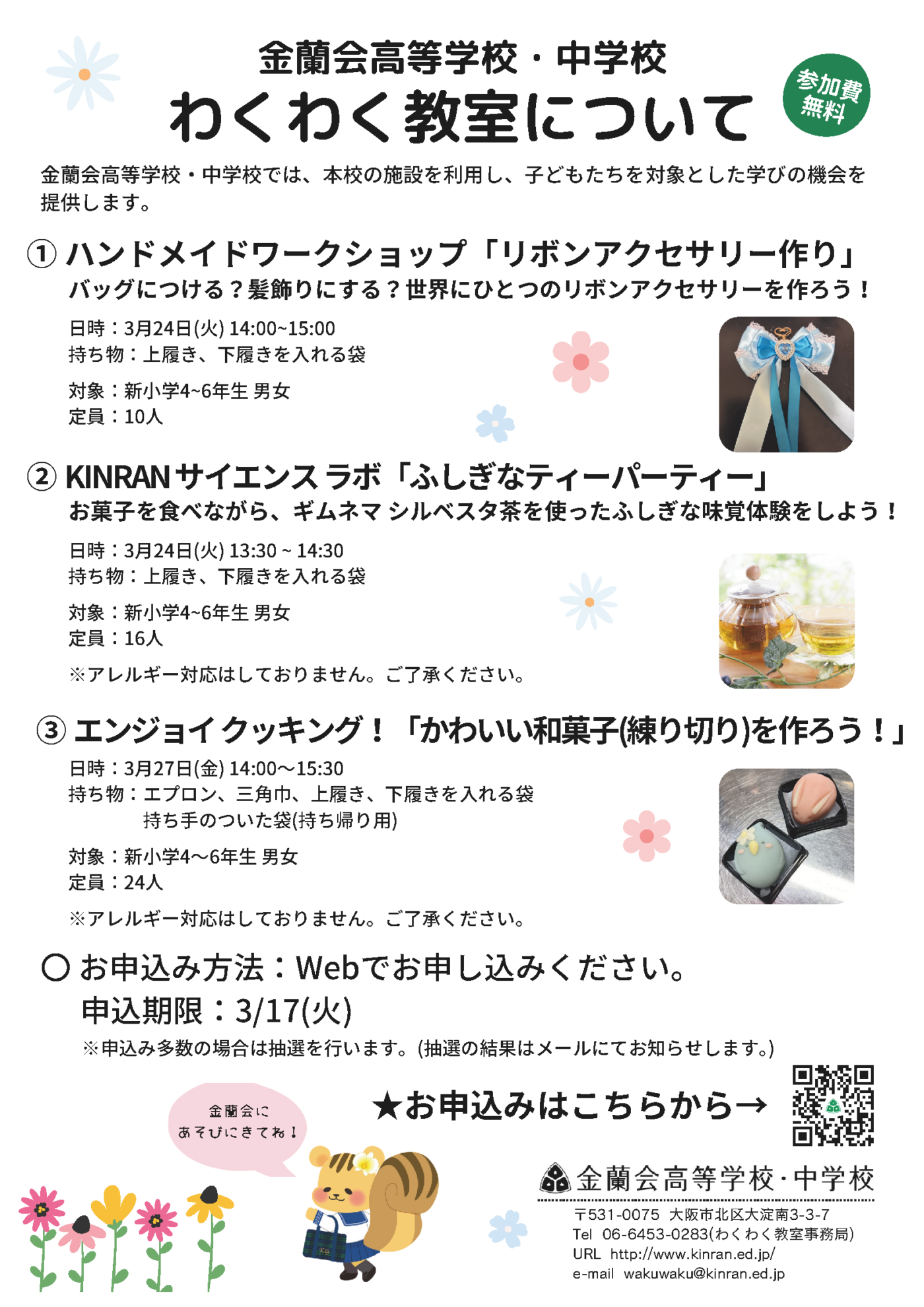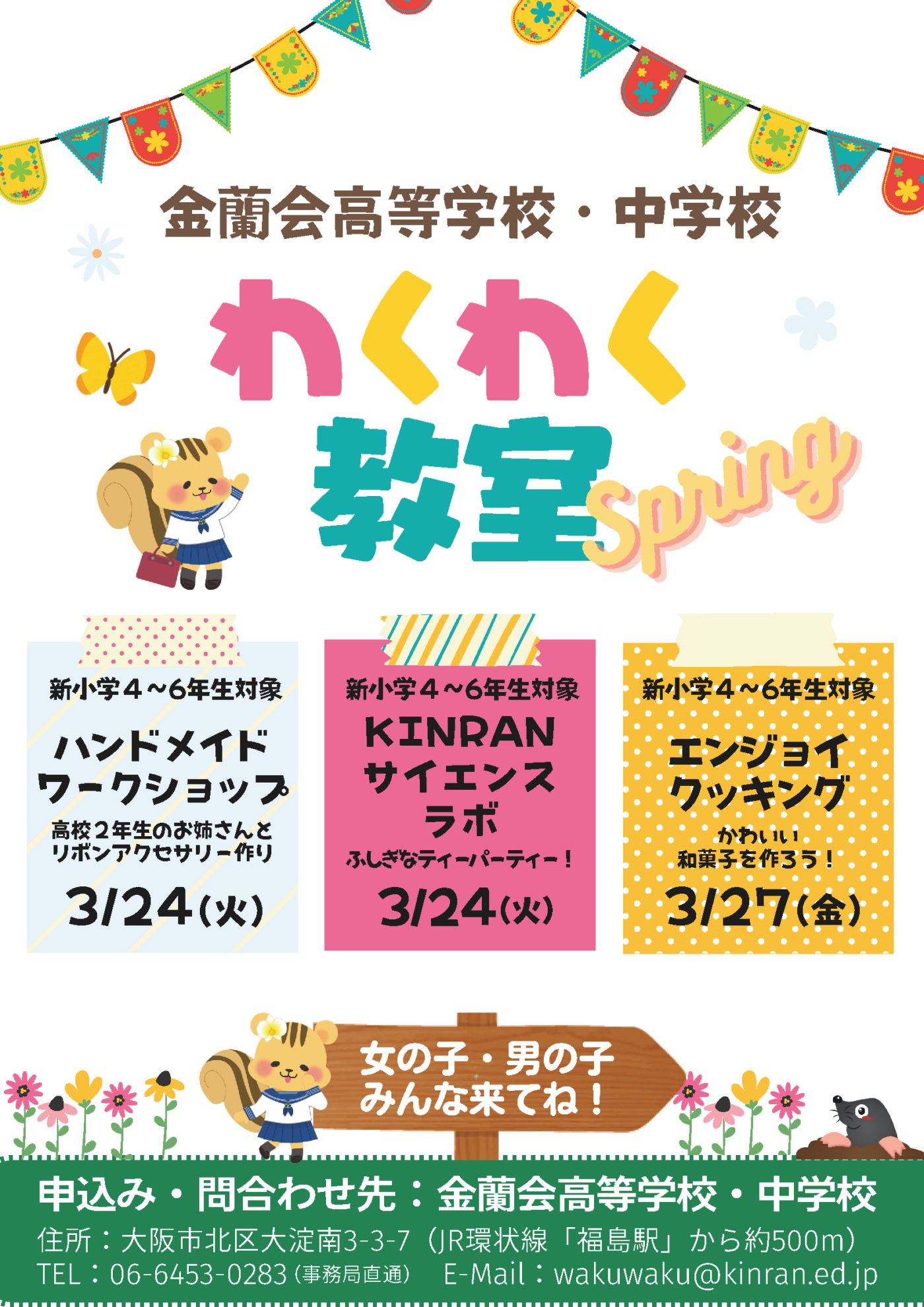 楽しい🎉おいしい🍡ふしぎ🔬がぎゅっと詰まった3つの講座をご用意しました🎀🍡🔬春休みの1日を、金蘭会で思いきり楽しもう🌷