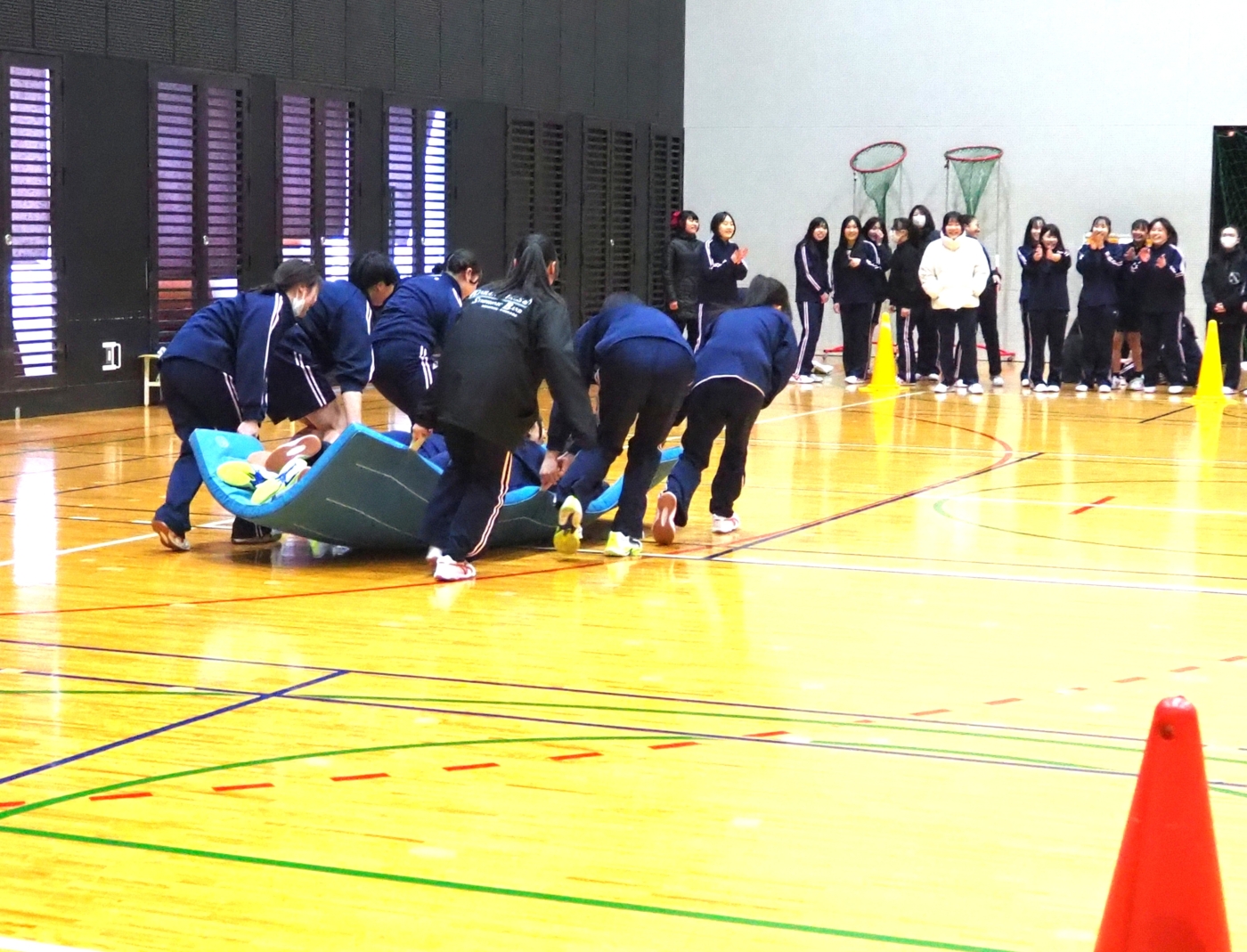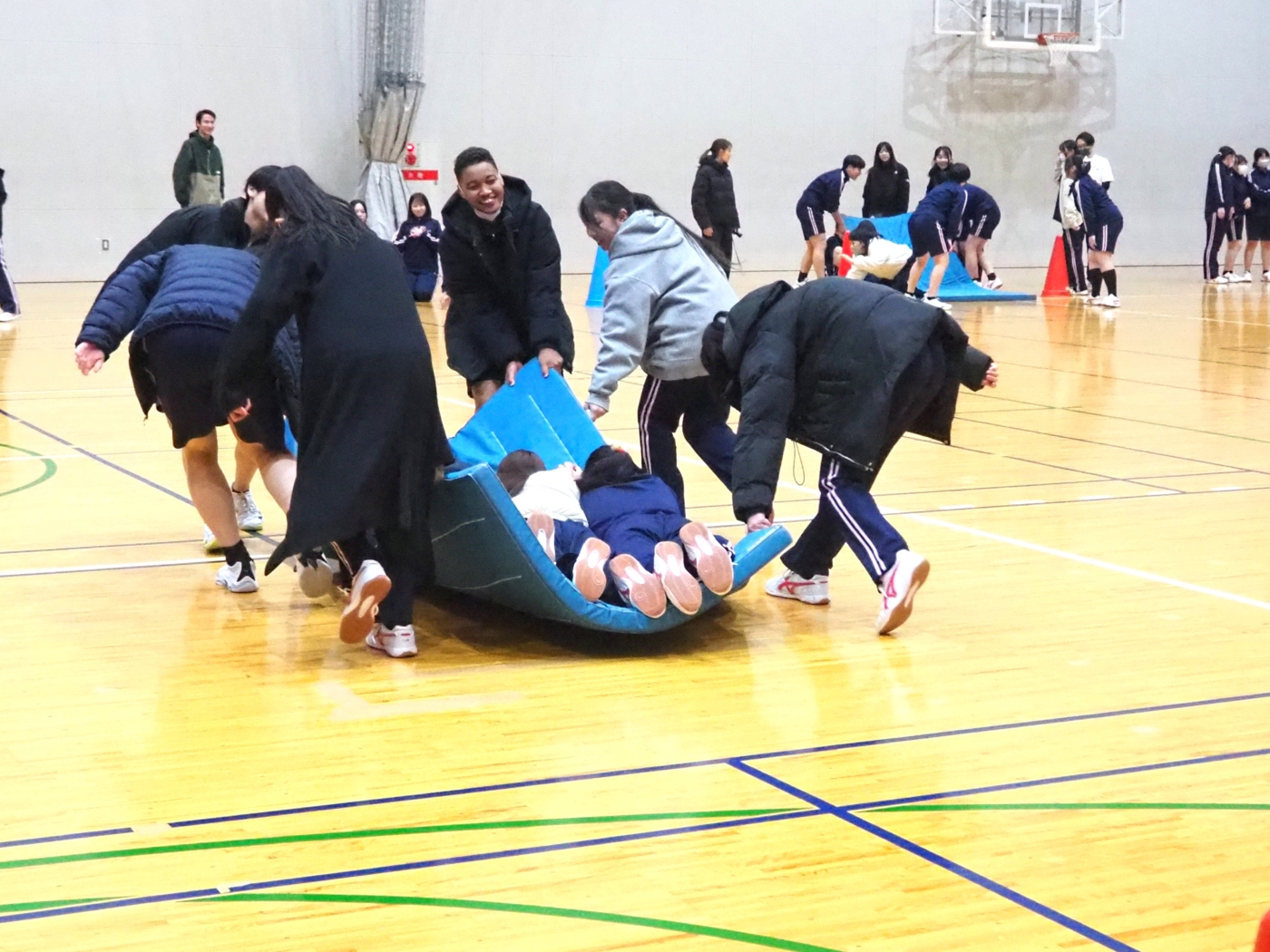 『魔法のじゅうたん』は、クラスメイトをマットに乗せて運ぶ競技。クラス全員を運び終わるまで何度も往復します。