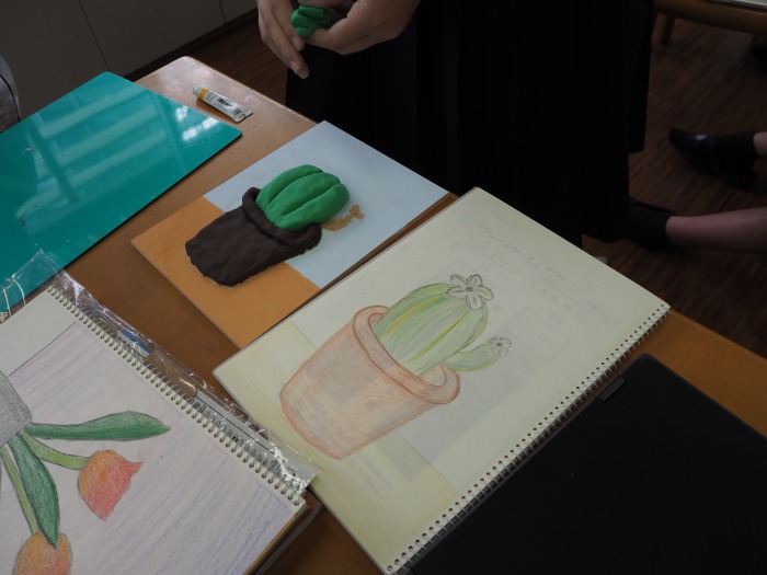 自分の好きな花を選んで、下書きをした後、粘土に色をつけて制作をしていました。