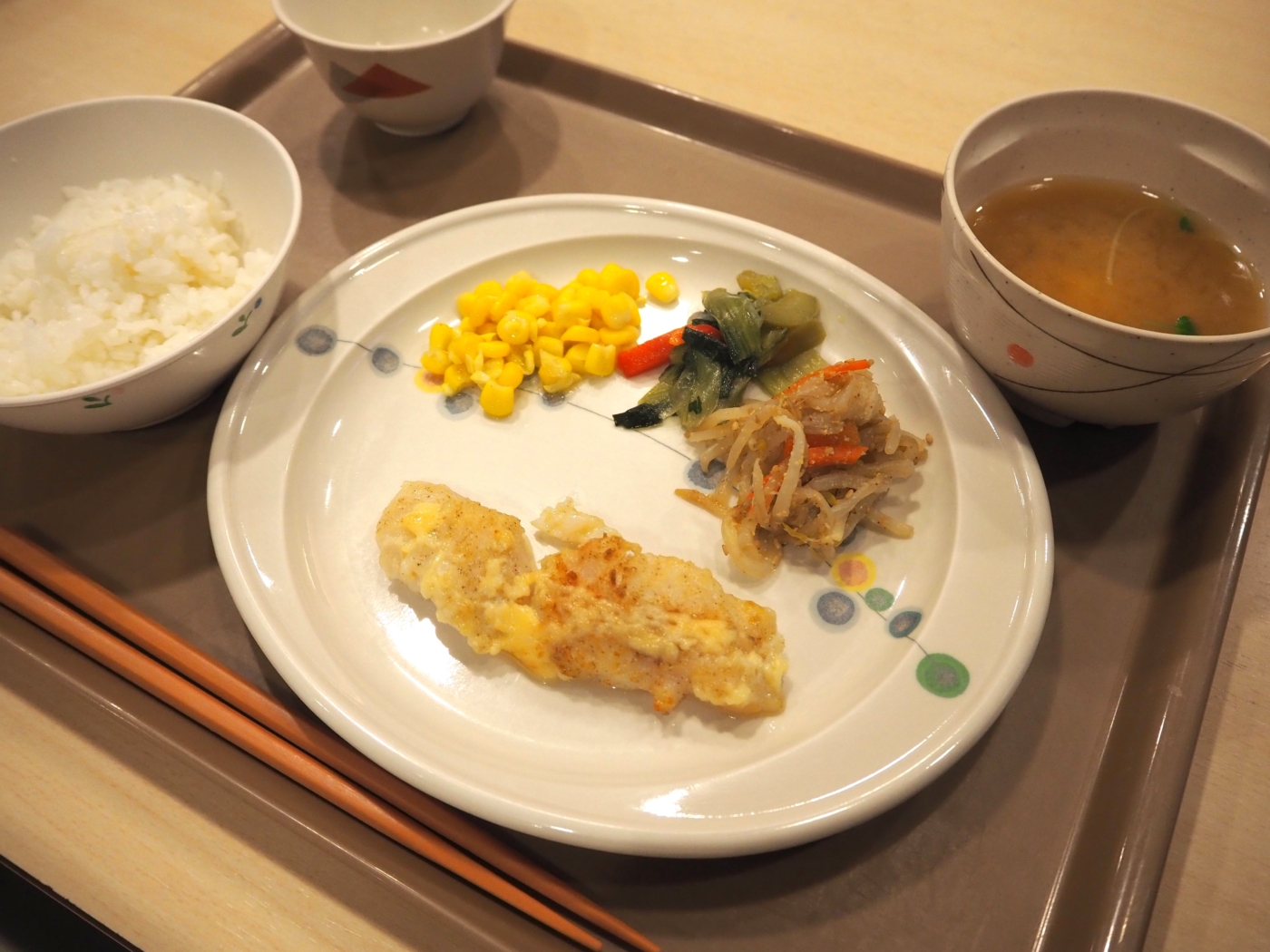今日の給食は、白身魚のマヨネーズ焼き、コーンソテー、小松菜のソテー、もやしのごま和え、ご飯、みそ汁でした。