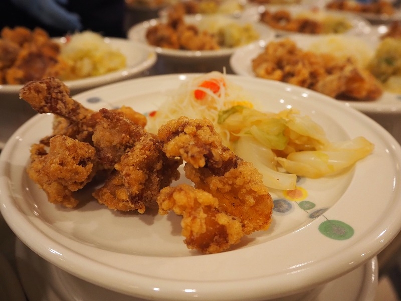 こちらのお2人は卵丼と鶏皮の唐揚げです。鶏皮の唐揚げはお皿にいっぱいですね!