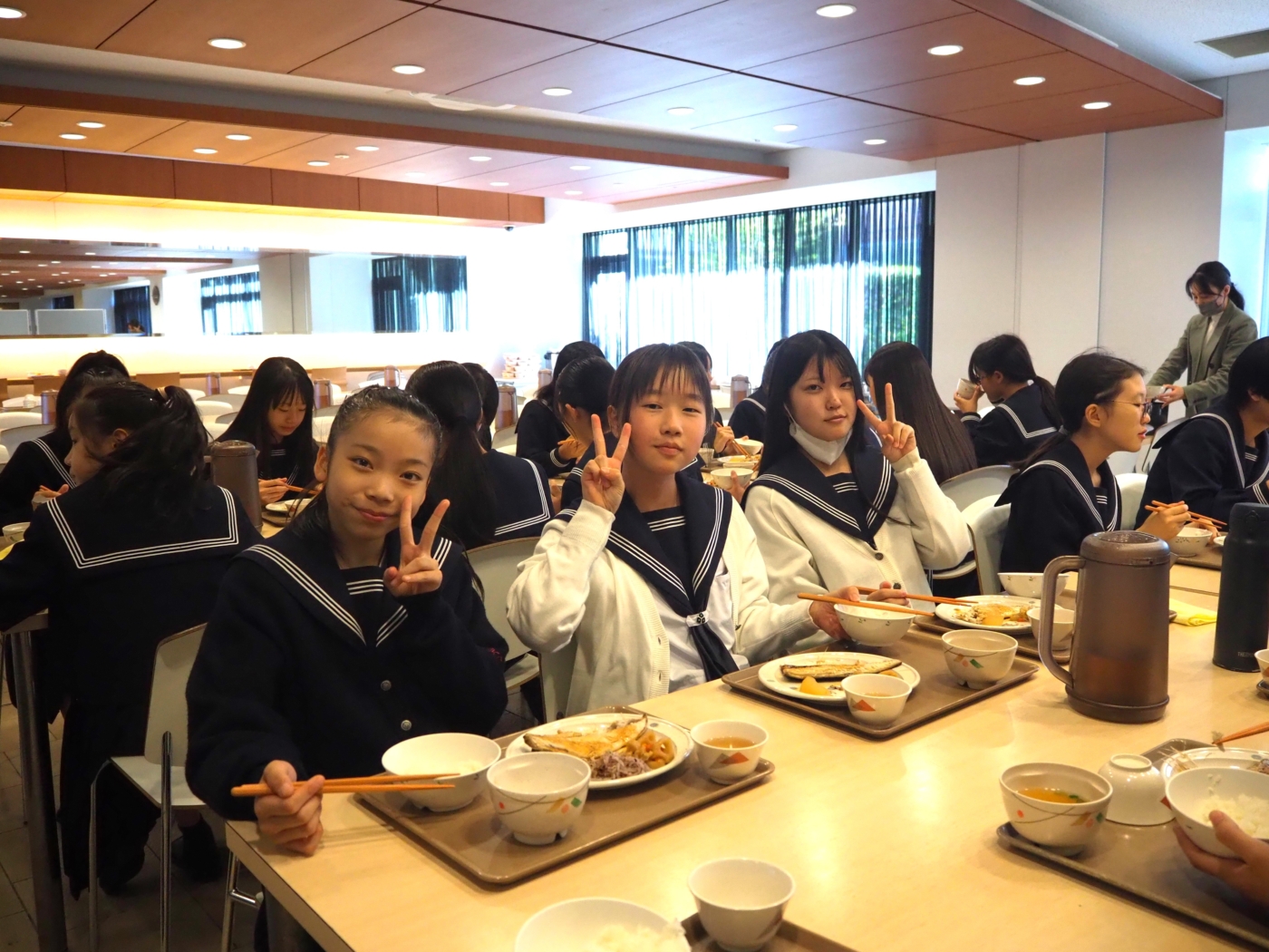 中学1年生は午後から社会見学に出かけるため、いつもより少し早い時間に食べていました。