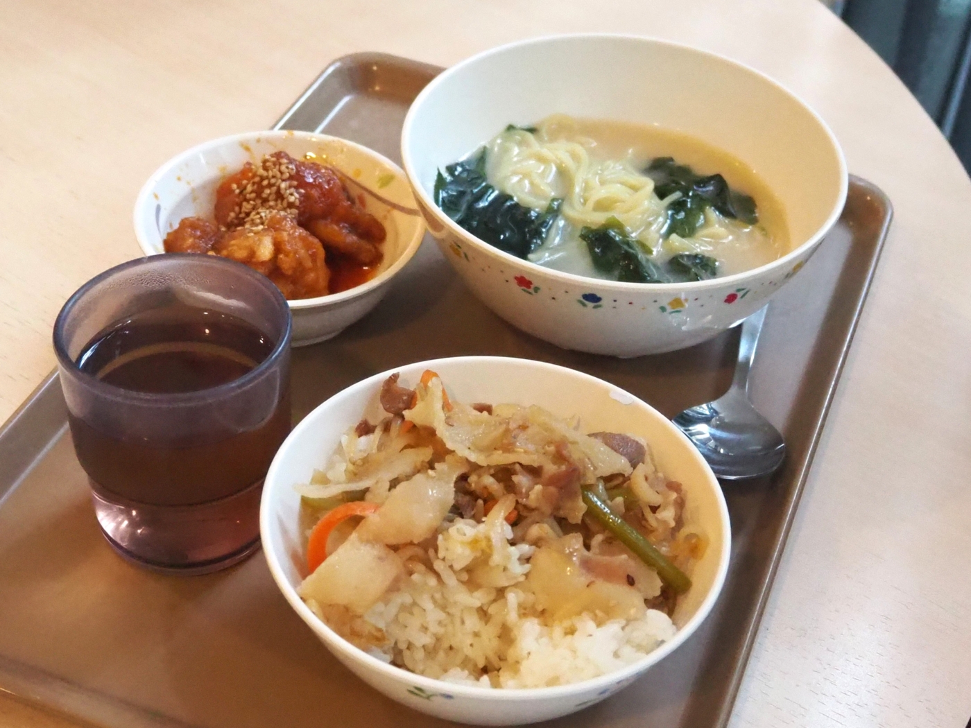 唐揚げやエビフライ、ヤンニョムチキンをキープしてからプルコギ丼や白湯ラーメンの列に並んでいた2人♪