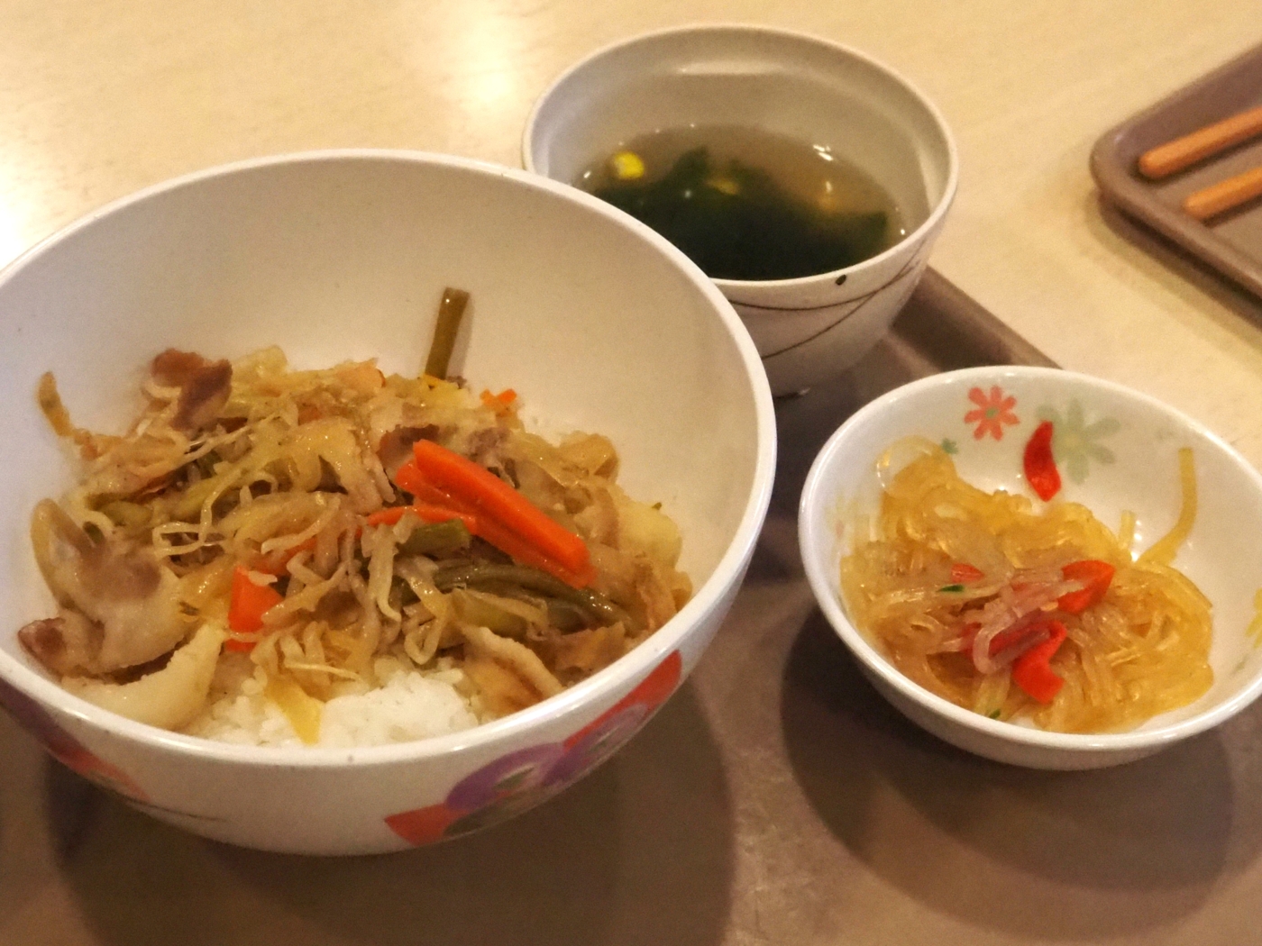 今日の給食は、プルコギ丼、春雨のポン酢和え、中華スープでした。