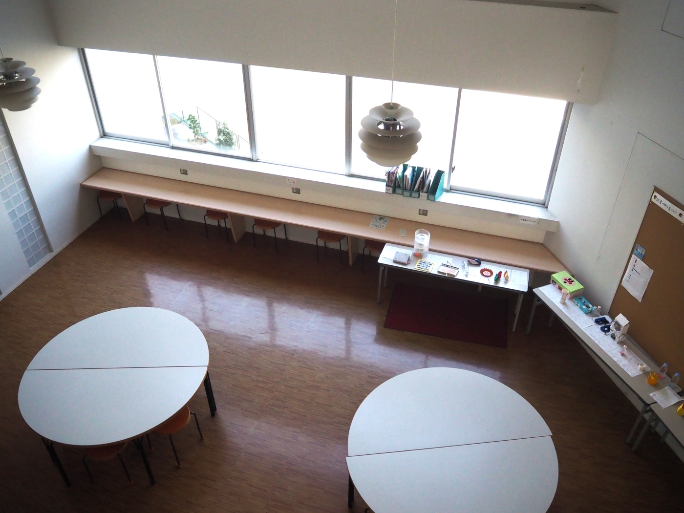 吹き抜けのコミュニケーションホールを見下ろしているところです。