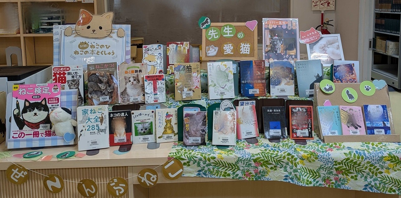 図書室では、2月22日の猫の日にちなんで「ねこの本」特集を展示中です。